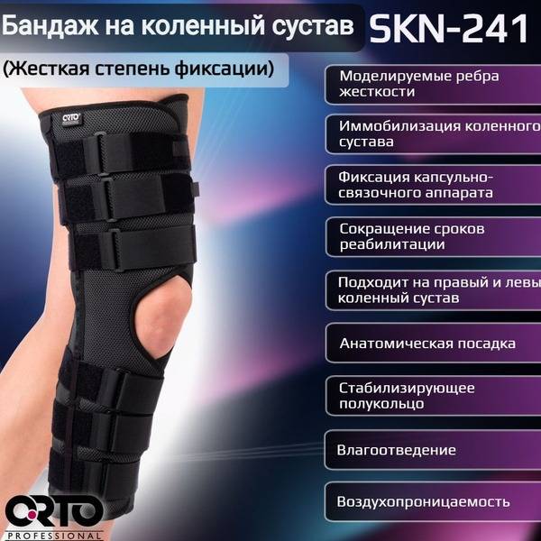 The ORTO SKN 241 knee brace provides firm support and stabilization for the knee joint. This hinged, adjustable brace features a non-stretch base fabric reinforced with two posterior profiled metal stays, two lateral metal stays, and six strategically placed elastic straps with Velcro closures. The innovative Flextra® fiber technology wicks away moisture for enhanced comfort. Ideal for: post-operative and post-injury rehabilitation; transport immobilization; hemarthrosis; instability of the capsular-ligamentous apparatus; prevention of flexion contractures; restoration of physiological limb axis; osteochondropathy; and pain management in osteoarthritis. Available in size S/M.