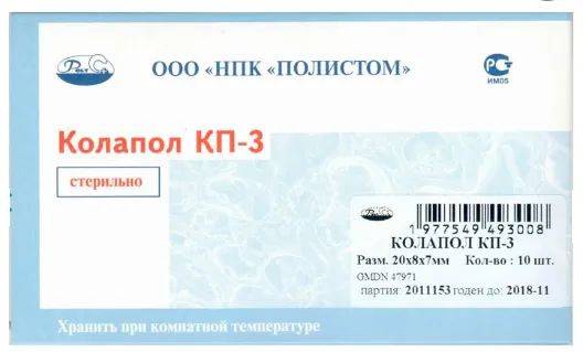 Kolapol KP-3 is a bone graft substitute composed of organic and inorganic components mimicking natural bone tissue. These 10 sterile plates measure 20x8x7 mm (0.15±0.05g each) and are white or off-white in color (TU 9391-003-77330104-2011). Custom sizes and thicknesses are available upon request.