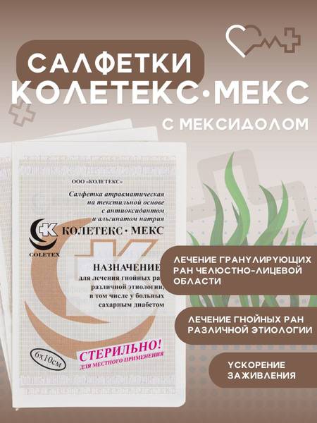 Koleteks-Mex medical wound healing pads offer advanced wound care with a unique combination of Mexidol and a biopolymer base. These atraumatic pads are designed for the effective treatment of wounds during the second phase of healing. Their innovative formula accelerates the healing process, promotes granulation tissue formation, and strengthens the body's natural defenses.