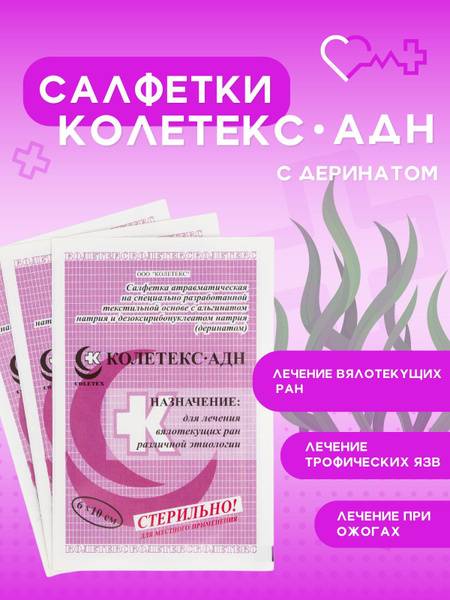 Koleteks-ADN medical dressings with Derinat (sodium deoxyribonucleate) represent a new generation of wound care. These therapeutic dressings accelerate the healing of wounds, cuts, abrasions, grazes, fissures, and chronic wounds of various etiologies, including those in diabetic patients. They significantly reduce the negative effects of radiation on the skin.