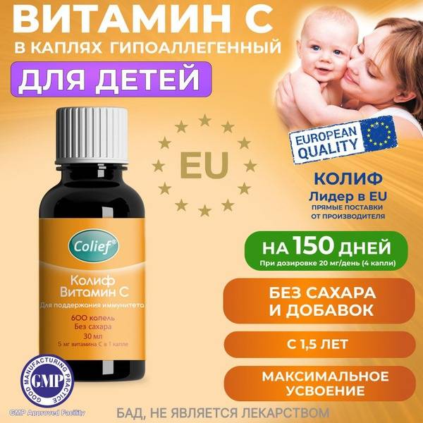 Support your child's immune system naturally with Colief® Vitamin C, a hypoallergenic, glycerine-based liquid vitamin C from Ireland's leading pediatric brand. Each drop delivers 5mg of naturally sourced Vitamin C, totaling 3000mg per bottle – a 6-month supply at recommended dosages. Free from sugar, artificial flavors, colors, and preservatives, it's gentle enough for children as young as 1 year old (EU/UK) or 1.5 years old (Russia). This delicious, easy-to-dose liquid vitamin C helps boost immunity and protect against common colds and flu. With only two ingredients – Vitamin C (ascorbic acid) and glycerine – it's perfect for children prone to allergies. Manufactured in Hungary to GMP standards. Enjoy peace of mind knowing you're providing your child with the best.