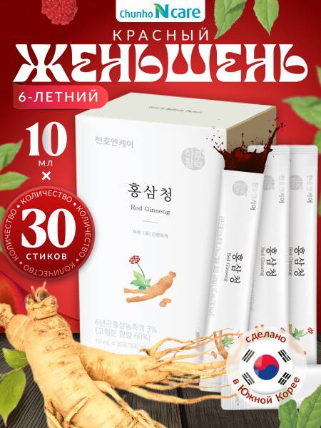 Korean Red Ginseng, Red Ginseng Extract, Ginseng Syrup, 6-Year-Old Ginseng, ChunhoNcare, Energy Boost, Immune Support, Natural Supplement, Health Supplement, Korean Health, Ginseng Benefits, No GMO, No Preservatives, No Added Sugar, 30 Sachets, 10ml Sachets, Dietary Supplement, Herbal Supplement, Antioxidant, Vitality, Well-being.