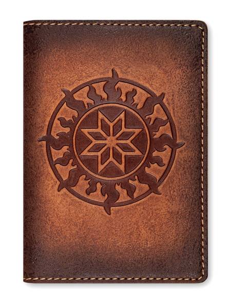 Crafted from genuine leather, this stylish and functional cover safeguards your passport (both domestic and international) from wear and tear. The intricate Alatyry Shield design is meticulously applied using hot stamping, ensuring lasting beauty and durability. Two additional pockets offer convenient storage for cards or other documents.