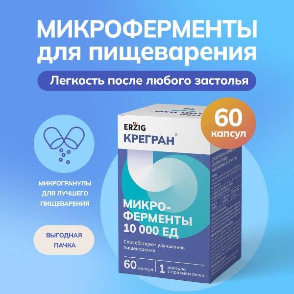 KREGRAN Microenzymes 10,000 IU, 60 capsules, supports improved digestion and compensates for pancreatic insufficiency. These microgranulated pancreatic enzymes are contained within a natural gelatin capsule, ensuring even distribution throughout the digestive tract. The unique microgranule technology facilitates rapid and complete digestion of carbohydrates, fats, and proteins. KREGRAN is recommended for individuals experiencing digestive discomfort, insufficient enzyme production, or those with dietary irregularities.