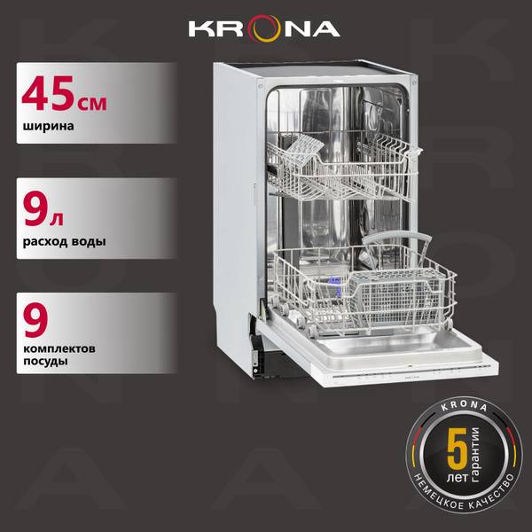 Experience superior cleaning performance with five versatile wash programs: intensive, eco, quick, and a practical half-load option to save water and energy. The adjustable upper rack provides ample flexibility for loading larger dishes and cookware. The KRONA GARDA 45 BI also incorporates AquaStop technology, offering unparalleled protection against leaks and ensuring peace of mind.