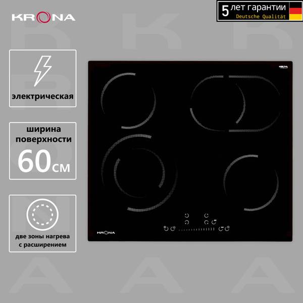 The stylish Krona Leggero 60 BL built-in glass ceramic cooktop elevates your kitchen with its elegant design and advanced features. Enjoy two expandable heating zones – a round zone up to 230mm and an oval zone up to 270mm – along with convenient features like child lock, automatic timer, boil-over protection, overheat protection, and a practical Stop&Go pause function. Backed by a 7-year warranty.