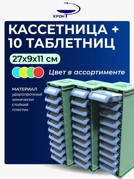 The KRONT Cassette and 10 Tablet Dispenser Kit is the ideal solution for efficient medication management in hospitals, clinics, sanatoriums, nursing homes, and preschools. This complete system streamlines the process of dispensing daily medications and vitamins.