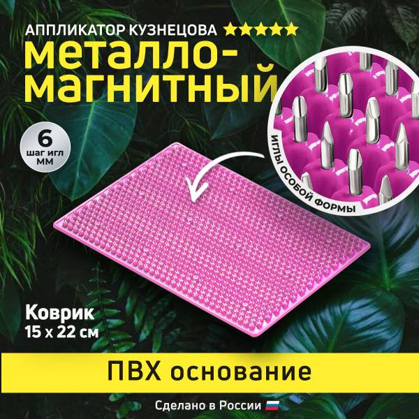 Kuznetsov applicator, acupressure mat, acupuncture mat, metal needle mat, massage mat, pain relief, back pain relief, neck pain relief, muscle pain relief, joint pain relief, headache relief, stress relief, relaxation, sleep aid, insomnia relief, PMS relief, menopause relief, cellulite treatment, flat feet treatment, polymetallic, magnetic therapy, Kuznetsov Laboratory, 15x22cm, raspberry, health and wellness, alternative therapy, self-care.