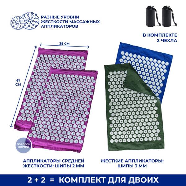 Experience the ultimate relaxation with our 4-piece Kuznetsov applicator mat set. This versatile set includes two double-layered mats with medium-firm plastic spikes and soft foam padding, and two single-layered mats with firmer spikes, offering a customizable massage intensity. The mats (approx. 24 x 15 inches (double-layered) and 23.6 x 16.1 inches (single-layered)) are ideal for back, neck, foot, and leg massage, promoting improved blood circulation, muscle relaxation, stress relief, and even cellulite reduction. The included carrying cases ensure convenient storage and portability. Perfect for couples or individual use, this acupuncture mat set provides a comfortable and effective at-home massage experience. Start with 5 minutes and gradually increase duration. Enjoy the therapeutic benefits of Kuznetsov applicator therapy! One-month warranty included.