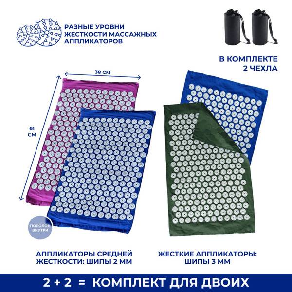 Kuznetsov applicator mat, acupuncture mat, acupressure mat, massage mat, pain relief mat, back massage, neck massage, foot massage, leg massage, cellulite reduction, muscle relaxation, stress relief, improved circulation, home massage, orthopedic mat, Kuznetsov applicator, 4-piece set, double-layered mat, single-layered mat, foam padding, plastic spikes, massage therapy, self-massage, wellness, relaxation, health, body care, therapeutic mat.