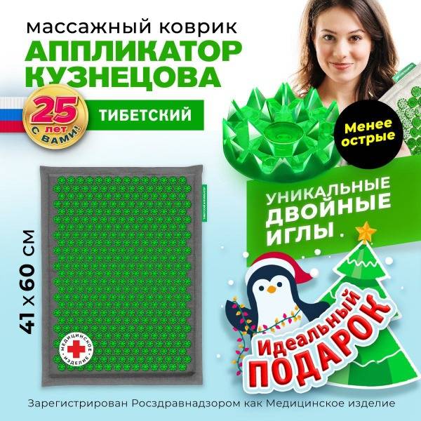 Experience the soothing relief of this large (41x60cm) Tibetan Kuznetsov applicator, featuring a 2cm thick soft padding for enhanced comfort. This versatile acupuncture mat is a registered medical device (Roszdravnadzor), perfect for therapeutic treatments, relaxation, or energy boosting, depending on the application area. Its unique features include: gentler, green plastic spikes; durable black linen fabric; double-pointed needles for a comfortable yet effective massage; and secure, heat-welded spike construction. This superior quality mat, made in Russia by Laboratory Kuznetsov, also includes a free "Acupuncture Massage Encyclopedia". Beneficial for pain relief (muscle, joint, back, neck, and headaches – including osteoarthritis and sciatica), improved energy levels, stress reduction, better sleep, PMS/menopause symptom relief, cellulite reduction (when used with appropriate products), and plantar fasciitis. Consult your doctor for additional applications. Overall dimensions: 50 x 69.5 cm.