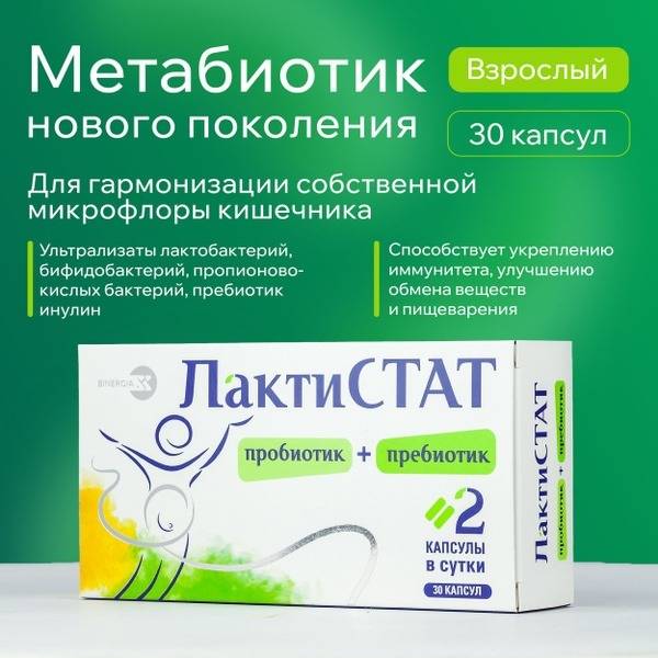 Description: Lactistat is a modern metabiotic supplement for adults, combining ultra-lysates of probiotic bacteria with inulin prebiotic fiber. It supports and restores intestinal microflora balance, strengthens immunity, and improves digestive health. Probiotic metabolites (from lactobacilli, bifidobacteria, and propionibacteria) contain essential nutrients for beneficial bacteria growth, including cell membrane fragments, enzymes, amino acids, peptides, proteins, short-chain fatty acids, polysaccharides, teichoic acids, peptidoglycans, bacteriocins, vitamins, and micronutrients. Inulin prebiotic fiber nourishes beneficial gut bacteria, promoting their growth and supporting healthy gut flora. It aids in bowel cleansing, improves digestion, and offers a gentle laxative and detoxifying effect. Lactistat is ideal for maintaining gut and overall well-being, especially during cold and flu season, periods of stress, and after antibiotic or other medication use (antivirals, antifungals, antiparasitics, cytostatics, weight-loss medications, etc.). It can also help alleviate symptoms of poisoning, diarrhea, and skin conditions (acne, pimples). Dosage: 1-2 capsules daily with room-temperature water. Can be taken concurrently with antibiotics. Available in a 30-capsule blister pack (small format) and a 60-capsule jar (large format). Lactistat Bebbi is available for children over 1.5 years old. A great gift for your immune system! Dietary Supplement. Not a drug.