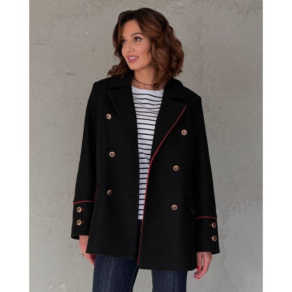 Description: This stylish Lady Charm short peacoat is a one-size-fits-most design, perfect for Russian sizes 42, 44, and 46. Crafted from luxurious Italian wool, it features a vibrant red satin lining and high-quality Italian club buttons. Eye-catching details include red stitching on the buttonholes, red piping on the sleeves and left lapel, and a single back vent. Sleeve length: 64cm; Back length: 76cm. Experience Italian craftsmanship and effortless chic.