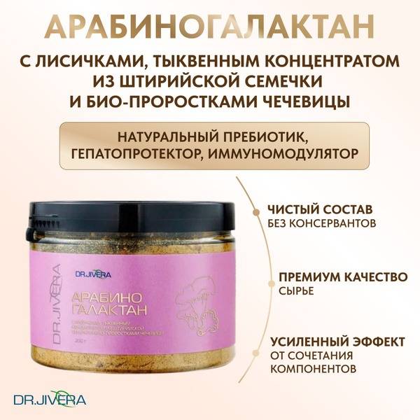 Experience the power of nature with Doctor Jivera Group's premium blend of Larch Arabinogalactan, Chaga mushroom, Styrian pumpkin seed concentrate, and lentil sprouts. This unique formulation is designed to support your overall health and well-being through a synergistic combination of potent natural ingredients.