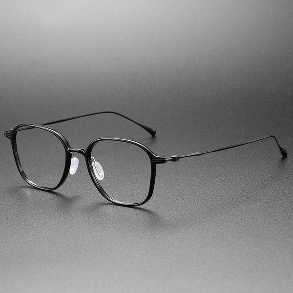 These stylish, large geometric eyeglasses frames offer a modern, transparent design. Available in black, transparent purple, transparent green, and grey-blue, these frames are suitable for a wide range of face shapes, especially larger faces. Crafted from durable plastic steel or pure titanium, these full-frame glasses support both nearsightedness and blue light protection. Featuring aspheric lenses and a comfortable fit, these frames are a perfect blend of fashion and function. Made in Shenzhen, China. (Article #8641, Fall 2022 Collection).
