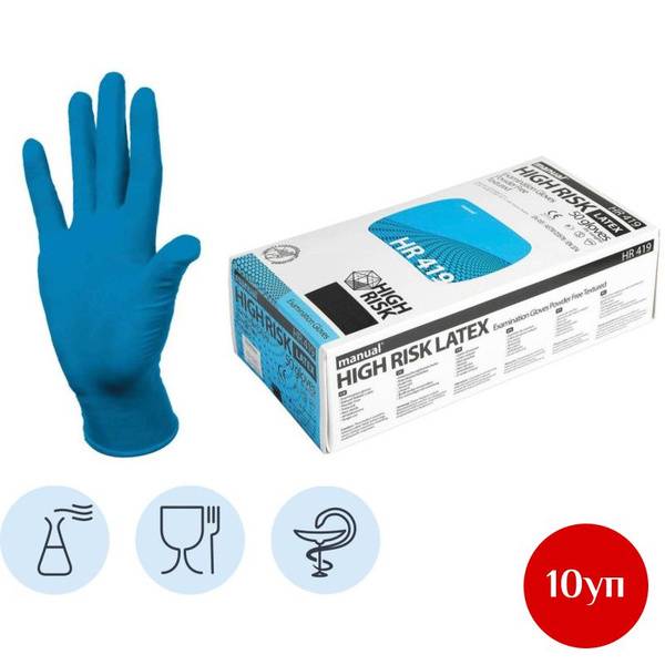 Manual HR419, High Risk Gloves, Latex Gloves, Examination Gloves, Medical Gloves, Non-Powdered Gloves, Non-Sterile Gloves, Blue Gloves, Size L, Disposable Gloves, Nitrile Gloves, Food Service Gloves, High Protection Gloves, Austria, TR CU 019/2011, GOST R 52239-2004, Medical Device, Bulk Pack, 50 Count, 25 Pairs, 10 Boxes, Extended Length Gloves, Textured Gloves, High-Risk Applications.