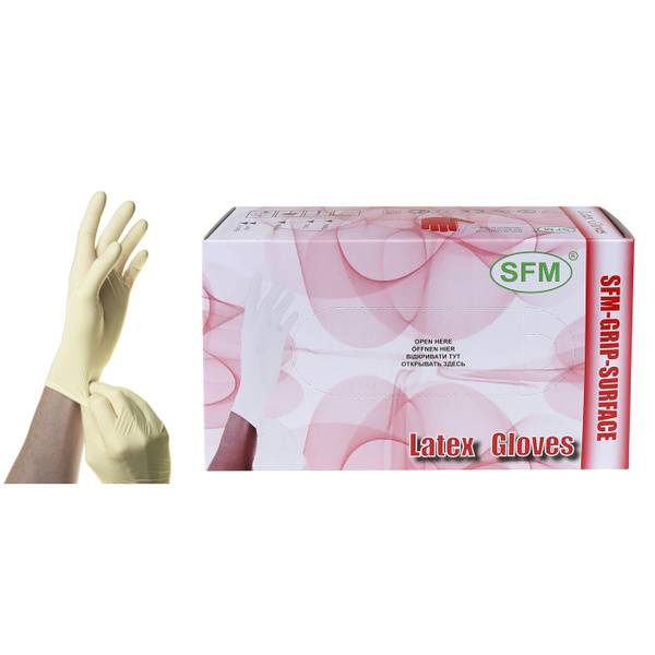 High-quality, non-sterile, powder-free latex examination gloves (SFM-GRIP-SURFACE) provide enhanced protection for both patients and healthcare professionals during medical examinations. These beige, textured gloves feature a rolled cuff (240mm) and single chlorination for superior durability and comfort. Designed for diagnostic use, these non-anatomical gloves offer a secure fit and reliable barrier protection. 5-year shelf life. Size M (7-8).