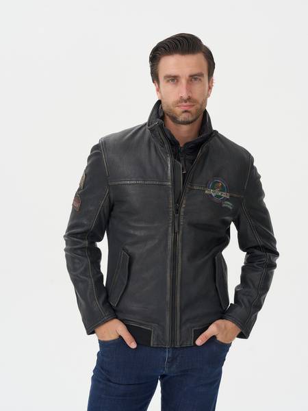 Description: Experience luxury with the exclusive GIPSY lambskin leather jacket. Crafted in Germany, this dark brown jacket features a unique aging technique for a sophisticated vintage look. Its short, biker-style design is enhanced by quilted lining for warmth, plus a detachable quilted vest for added versatility. Detailed with stylish patches on the chest and sleeve, and practical flap pockets, this jacket offers both style and functionality. A comfortable ribbed knit waistband completes the look.
