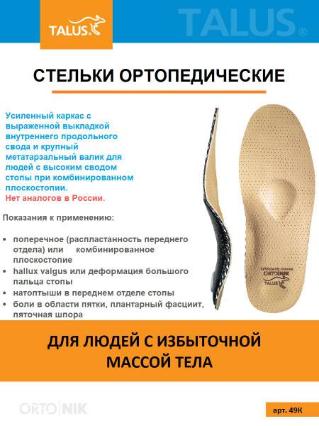 Experience superior comfort and support with Talus 49K orthotic insoles, designed for individuals weighing over 220 lbs (100 kg) and suffering from flat feet, high arches, plantar fasciitis, or heel spurs. These insoles feature a reinforced rigid frame for exceptional arch support and shock absorption, particularly in the forefoot.