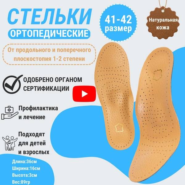 Experience superior comfort and support with these genuine leather orthotic insoles. Crafted with a top layer of premium calfskin leather and a latex foam base infused with activated charcoal, these perforated insoles wick away moisture and neutralize odor. Designed to provide effective prevention and treatment of flat feet (pes planus), these supportive insoles feature a rigid arch support to maintain proper anatomical foot alignment. The built-in heel cushion absorbs shock, reducing strain during walking and running. Ideal for those who spend long hours on their feet, these insoles offer relief from foot and joint pain, and are recommended for individuals with flat feet (prolongitudinal, transverse, and combined flatfoot of grades 1 and 2), excess weight, pregnancy, spinal or lower limb joint conditions, and varicose veins/edema. Available in sizes 35-46 (this listing is for sizes 41-42, dual-size). Easily trimmed to fit. Suitable for men and women, and compatible with most closed-toe footwear. Measure your foot length for accurate sizing.