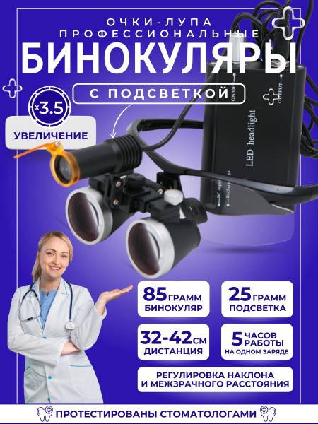 binocular loupes, dental loupes, jeweler's loupes, magnifying glasses, flip-up loupes, 3.5x magnification, LED light, adjustable interpupillary distance, lightweight loupes, comfortable loupes, surgical loupes, precision loupes, eye protection, electronics repair, watch repair, dentistry tools, jewelry tools, high-quality loupes, Russian-tested loupes.