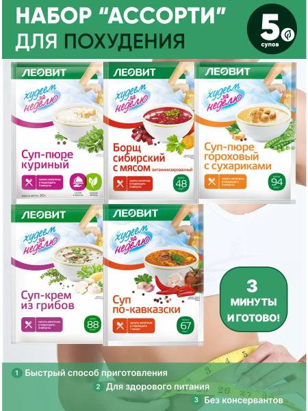 The Leovit "Assortment" Weight Loss Soup Set offers a convenient and healthy way to support your weight loss goals and maintain a balanced lifestyle. This set includes five delicious and diverse soup varieties, each carefully formulated to provide essential nutrients while supporting your dietary needs. These quick-cooking soups are not only time-saving but also packed with vitamins and minerals, making them perfect for busy individuals committed to healthy eating and weight management. Enjoy a variety of satisfying flavors and high-quality ingredients without sacrificing taste or convenience. Achieve your weight loss goals with Leovit.