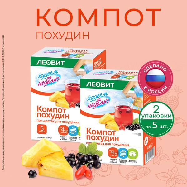 Keywords: Leovit Pokhudin, diet compote, weight loss, weight management, slimming, detox, natural ingredients, magnesium sulfate, zinc sulfate, bromelain, low-calorie, convenient, sachets, clinically proven, healthy digestion, metabolism regulation, fast preparation, apple, pineapple, barberry, blackcurrant, sublimated food.