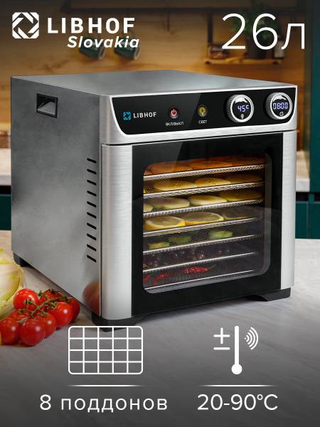 The Libhof FDW-08 food dehydrator is a convenient and reliable appliance for healthy living enthusiasts. Its powerful 800W motor and 26-liter capacity enable quick and efficient drying of various fruits, vegetables, and herbs. Crafted with elegant design and high-quality materials for lasting durability, it features electronic controls with a digital display, timer, and adjustable temperature settings. A built-in fan ensures even heat distribution, preventing over-drying, while horizontal airflow dries food uniformly across all 8 trays. Expand your culinary possibilities by creating delicious fruit leather. Its compact size fits easily into any kitchen, and the generous power cord length adds to its user-friendliness. The Libhof FDW-08 is the perfect choice for health-conscious individuals seeking fresh, nutritious foods year-round.