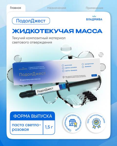 PodolGellt light-curing flowable gel in a delicate light pink shade, presented in a convenient 1.5g size. This premium gel is expertly formulated for the creation of natural-looking artificial nail bases. Achieve perfect polymerization with both LED and UV lamps (350-400 nm) in just one minute. Ideal for professional nail technicians seeking high-quality, reliable materials for beautiful nail enhancements.