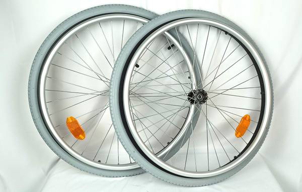 Description: This listing features a pair of lightweight, inflatable rear wheels designed for the Ottobock Start wheelchair. These standard-sized wheels utilize a Schrader valve (machine nipple) for easy inflation. The wheels are marked 24 x 1 3/8 (37-540), have a 60cm diameter, and a 12mm axle diameter. The bushing depth is 48mm (distance between bearings). Axles are not included but can be found in our store – visit our shop profile for options.