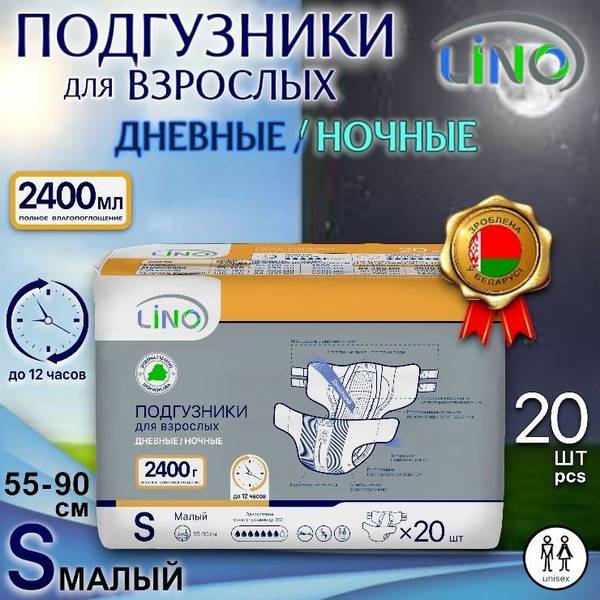 Experience superior comfort and protection with Lino S adult diapers and underwear. These high-absorbency (2400ml) briefs provide up to 12 hours of dryness, perfect for both day and night use. This 20 count pack is size S (55-90cm).