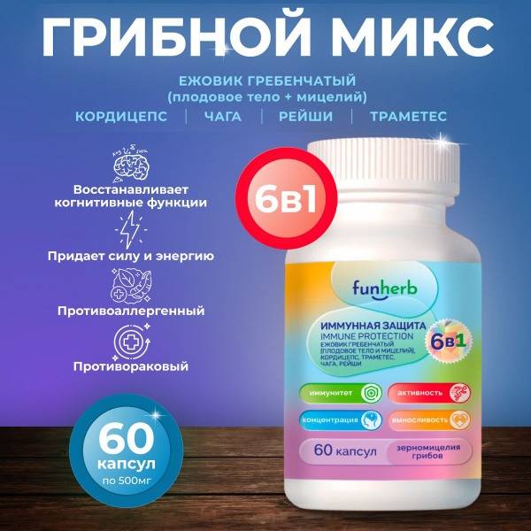 Description: This potent mushroom blend combines Lion's Mane (mycelium & fruiting body), Turkey Tail, Cordyceps, Chaga, and Reishi mushrooms in a 60-capsule supplement (500mg per capsule) designed to support overall health and well-being. This carefully formulated blend promotes natural energy, strengthens the immune system, and may help combat thrombosis and cancerous tumors. The dried, powdered mushrooms offer nootropic benefits, supporting brain tissue regeneration, cancer prevention, and cognitive function. This supplement leverages the unique properties of each mushroom: