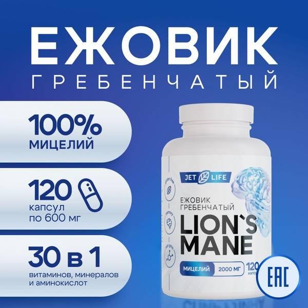 Lion's Mane, Hericium erinaceus, Lion's Mane Mushroom, Nootropic, Neurostimulant, Immunomodulator, Brain Health, Cognitive Enhancement, Memory Improvement, Focus, Stress Relief, Anxiety Relief, ADHD, Autism, Parkinson's Disease, Alzheimer's Disease, Dementia, Anti-inflammatory, Antioxidant, Immune Support, JetLife, Supplement, Capsules, Mycelium, EAC Certified, Natural, Health Supplements, Brain Supplement, Cognitive Supplement, Dietary Supplement.