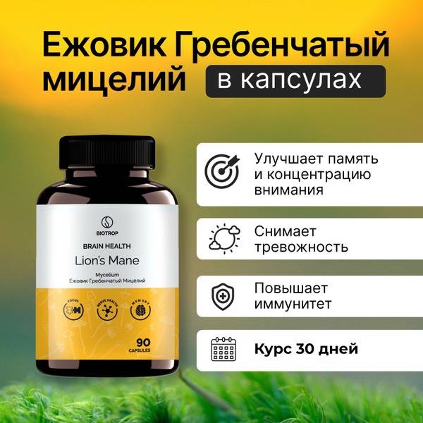 Keywords: Lion's Mane, Hericium erinaceus, Mycelium, Brain health, Cognitive function, Memory improvement, Focus, Concentration, Immune support, Anti-inflammatory, Antioxidant, Nootropic, Supplement, Capsules, Organic, Natural, Made in Russia, Biotrop, Angel Healthy.