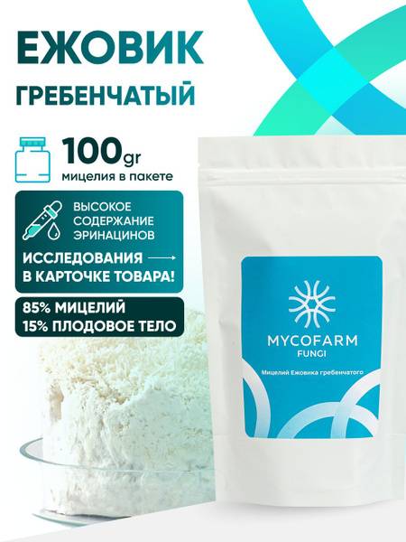Lion's Mane, Lion's Mane Mycelium, Hericium erinaceus, Hericium Pride, Mycelium Powder, Nootropic, Cognitive Function, Memory Improvement, Brain Health, Neurodegenerative Diseases, Alzheimer's, Parkinson's, MS, Anxiety Relief, Mood Booster, MycoFarm, Organic Mushrooms, Russia, Supplement, Natural Remedy, BDNF, NGF, Erinacines, Polysaccharides, Hericenones, 100g, Ozon