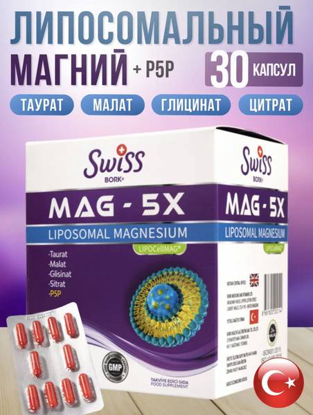 Experience superior absorption with our Swiss-made MAG-5X Liposomal Magnesium B6 Complex. This supplement combines five forms of magnesium (taurates, malate, citrate, glycinate, and P5P) for enhanced energy, muscle function, bone health, stress reduction, and overall well-being. 30 capsules. Learn more about the benefits of liposomal magnesium and why this unique formulation is superior. Discover how it can improve magnesium for sleep, magnesium for stress, and overall magnesium for energy levels. Ideal for magnesium for athletes and magnesium supplement for women's health.