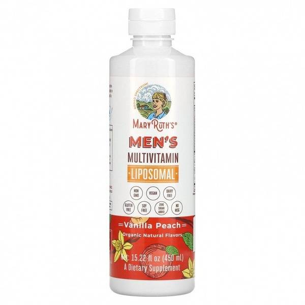 Experience superior nutrient absorption with MaryRuth's Men's Liposomal Multivitamin, a delicious vanilla peach liquid formula created by MaryRuth Ghiyam, a health educator and former instructor at the American Academy of Nutrition. Unlike traditional capsules or tablets, this innovative, non-GMO, vegan, dairy-free, gluten-free, and soy-free formula utilizes liposomal encapsulation for enhanced bioavailability. Enjoy faster absorption and improved utilization of essential vitamins and minerals for enhanced energy, cognitive function, and immune support. This supplement is free from fillers, binders, artificial sweeteners, added sugar, and sodium glutamate. Made with organic natural flavors, it's the perfect way to support your overall well-being. Each bottle is BPA-free. Experience the MaryRuth difference – superior quality, optimal absorption, and a great taste. Support your energy levels, cognitive health, immune function, and overall well-being today!