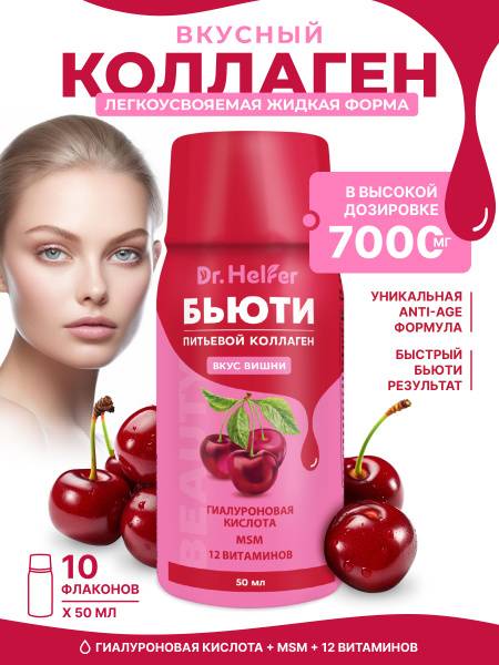 Dr. Helfer Beauty Collagen is an innovative liquid collagen with a delicious cherry flavor and a unique, expertly formulated composition. Our collagen drink is enriched with hyaluronic acid, methylsulfonylmethane (MSM), and a vitamin complex. Its unique liquid form ensures 98% absorption – 5 times more effective than powders or capsules. Developed by doctors, our high-dosage collagen boasts a scientifically proven, balanced formula featuring the most bioavailable form: hydrolyzed type I and III collagen. It supports joint, muscle, tendon, and vascular health; strengthens hair and nails; promotes youthful vitality; reduces arthritis risk; normalizes metabolism; and may aid in weight management. Conveniently ready-to-drink, no mixing required. Improves skin elasticity and firmness. Recommended daily intake: one bottle. Dietary supplement. Not a drug.
