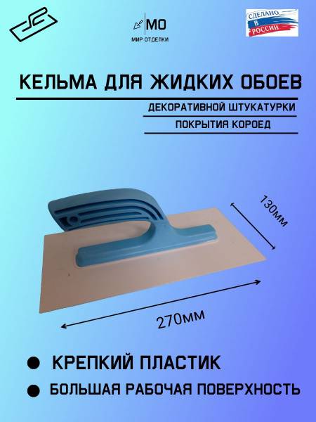 Description: This high-quality plastic trowel is perfect for applying liquid wallpaper, textured coatings like bark beetle (koroed), and other decorative materials. Its large 270x130mm working surface allows for faster coverage of larger areas, while the straight edges ensure precise application in corners and tight spaces. Ideal for various applications including: liquid wallpaper, dry mixes, textured coatings, plaster, putty, and wall repair. The ergonomic handle features a lanyard hole for convenient storage, and the flexible yet durable blade ensures a smooth, professional finish every time. This durable and easy-to-use trowel is a must-have tool for any DIY enthusiast or professional.