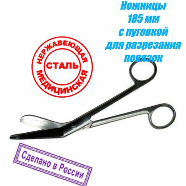 High-quality, Russian-made 185mm Lister bandage scissors (N-14) designed for precise cutting of bandages and clothing. Weighing only 85g, these blunt-ended, horizontally-curved scissors feature a rounded safety button to prevent accidental skin punctures. Ideal for medical professionals and first responders.