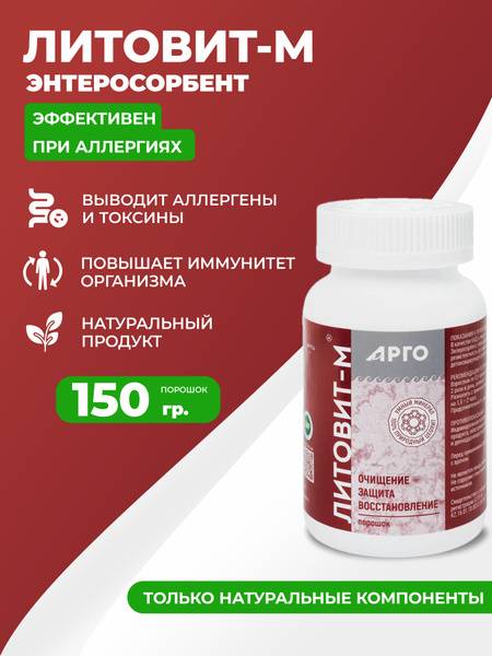 Keywords: Litavit-M, Litavit M, Nov, Argo, enterosorbent, allergy relief, psoriasis treatment, immune support, immunomodulator, natural remedy, toxin removal, detox, healthy digestion, skin health, metabolic support, 150g, powder, natural ingredients, health supplement, wellbeing