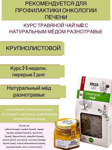 Keywords: liver cancer, herbal tea, VolgaLad-62, liver support, natural remedies, complementary therapy, holistic health, cancer treatment support, herbal supplement, honey, phytonutrients, well-being, immune support, 70g, 140g, two packs, organic tea