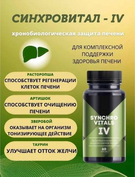Keywords: Synchrovital IV, liver support, liver health, chronobiology, liver detoxification, milk thistle, silymarin, St. John's wort, Baikal skullcap, artichoke extract, tauric acid, bile flow, hepatoprotective, antioxidant, liver regeneration, natural liver support, herbal liver supplement, digestive health, gallstone prevention, chronobiological supplement, two-phase complex.