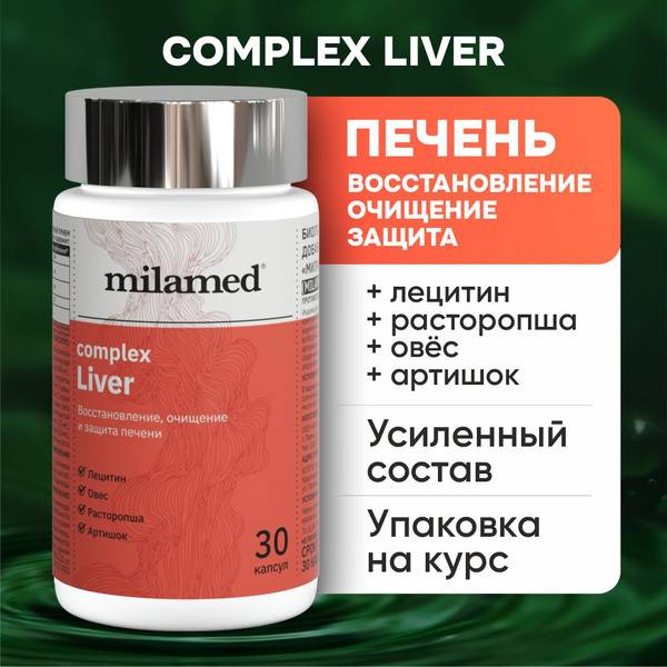Milamed Liver Complex is a unique dietary supplement formulated for comprehensive liver support. This bioactive complex combines L-methionine, lecithin, alpha-lipoic acid, and potent herbal extracts including andrographis, agrimony, dandelion root, oat seeds, milk thistle, artichoke leaf, and rhodiola rosea root. Innovative technologies enhance the bioavailability and efficacy of these phytonutrients. Each tablet contains: L-methionine hydrochloride (80mg), phosphatidylcholine (lecithin) (70mg), andrographis paniculata extract (50mg), agrimony eupatoria extract (40mg), dandelion root extract (40mg), oat seed extract (40mg), milk thistle fruit extract (35mg), artichoke leaf extract (25mg), rhodiola rosea root extract (20mg), and alpha-lipoic acid.