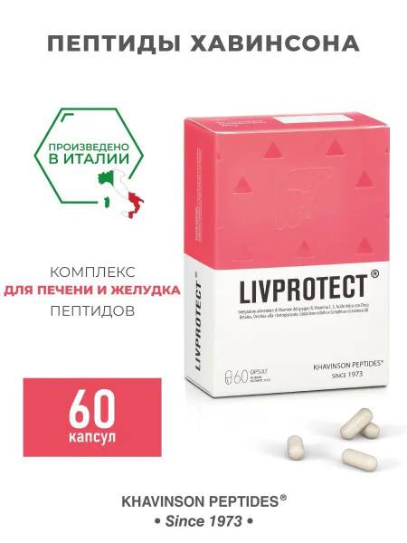 Description: LivProtect is an ultra-enriched complex of peptide bioregulators and essential vitamins designed to cleanse and restore liver cells. Recommended for liver cell regeneration after medical treatments (including antibiotics), poisoning, and alcohol-induced liver damage. Formulated with liver peptides, vitamins C, E, B2, B6, B9, B12, biotin, and glutathione. Backed by over 40 years of clinical research and published in certified international scientific journals, LivProtect's peptide bioregulators offer proven efficacy and are known for their physiological action at the cellular level, with no reported side effects. This innovative Italian liver support supplement comes in a 2-month supply (60 capsules, 1 capsule daily).