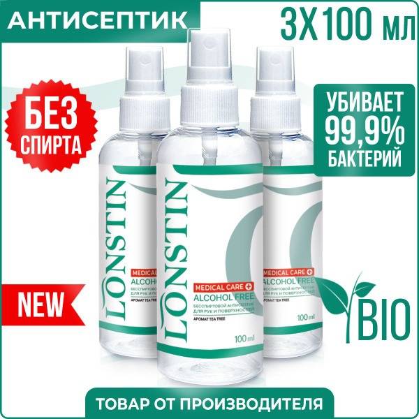 Alcohol-free hand sanitizer, hand spray sanitizer, tea tree oil sanitizer, antibacterial spray, disinfectant spray, surface disinfectant, medical disinfectant, salon disinfectant, manicure disinfectant, Lonstin, benzalkonium chloride, BAC, hypoallergenic sanitizer, non-irritating sanitizer, long-lasting sanitizer, bulk hand sanitizer, Russia certified sanitizer, 3 x 100ml sanitizer.