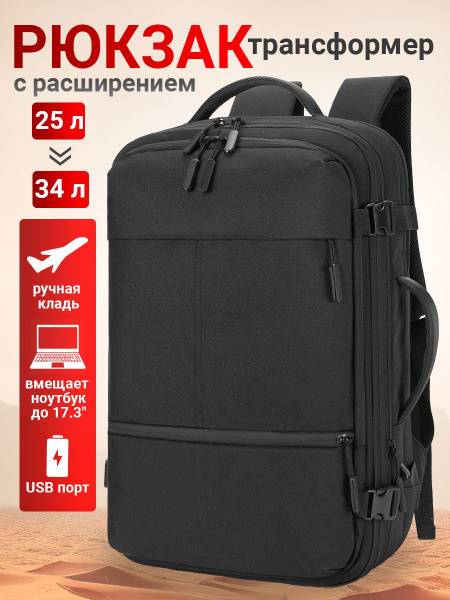 The Luggarika men's urban laptop backpack is a versatile 30L transformer bag, perfect for travel, commuting, and everyday use. Its expandable design (25-30L) adapts to your needs, making it ideal for work, school, the gym, or weekend getaways. This black backpack boasts a water-resistant, easy-to-clean material, protecting your belongings from the elements. Carry your 17.3-inch laptop, tablet, and A4 documents safely and conveniently. Dedicated compartments keep everything organized, while a hidden anti-theft pocket safeguards valuables. Ergonomic padding provides all-day comfort, and a trolley sleeve allows for effortless attachment to rolling luggage. A side handle and USB charging port add extra convenience. This carry-on compliant backpack is the ultimate solution for the modern traveler.