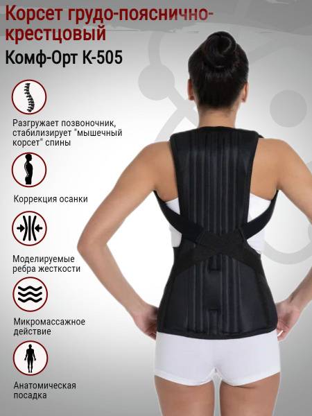 thoracolumbosacral corset, orthopedic corset, back brace, spinal support, herniated disc, vertebral fracture, spondylosis, sciatica, lumbago, osteochondrosis, post-operative rehabilitation, injury rehabilitation, back pain relief, posture correction, kyphosis, scoliosis, spondylolisthesis, osteoporosis, K-505, Comfort-O-rt