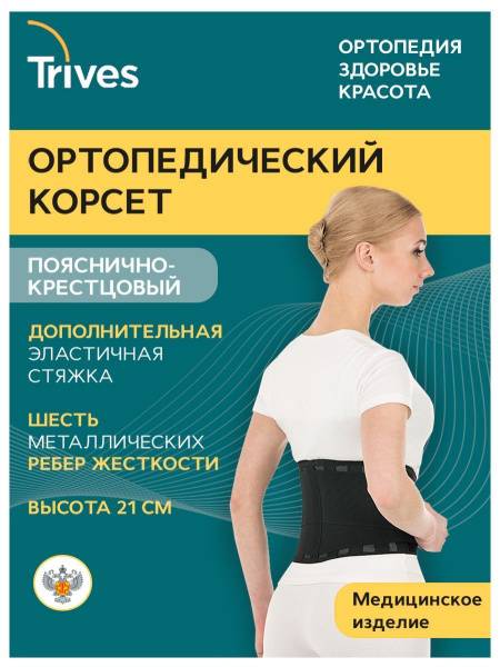 The Trives T.57.02 orthopedic lumbar support brace provides effective back pain relief and injury prevention. This medium-firm back brace features six flexible stays for superior support and stabilization of the lower back and sacroiliac joint. Ideal for treating and preventing conditions such as osteochondrosis, radiculitis, sciatica, lumbago, herniated discs, and spinal stenosis, this unisex brace is perfect for athletes, manual laborers, and individuals experiencing lower back pain. Made from breathable, skin-friendly elastic material, its comfortable, discreet design allows for all-day wear. The double elastic closure ensures a secure and customizable fit. 21cm height.