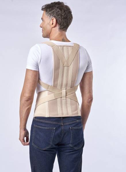 Designed for both men and women, this back brace conforms to the body's natural shape, avoiding pressure on the ribs and pelvis. The recline straps maintain optimal postural correction without restricting underarm movement, thanks to a soft, comfortable lining. The removable, adjustable support ribs allow for precise molding to the individual's back.